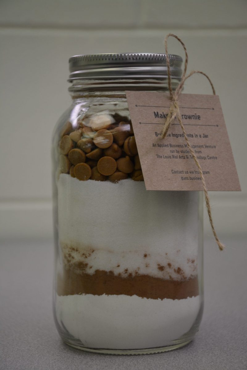 Make-A peanut butter brownie ingredients in a jar. Add eggs, oil, water, and vanilla to the dry ingredients and cook in the oven for delicious home-baked brownies. Great as a gift or an activity for the family.
